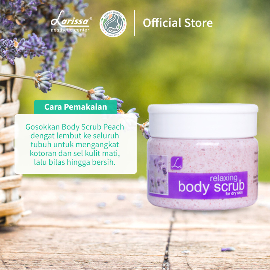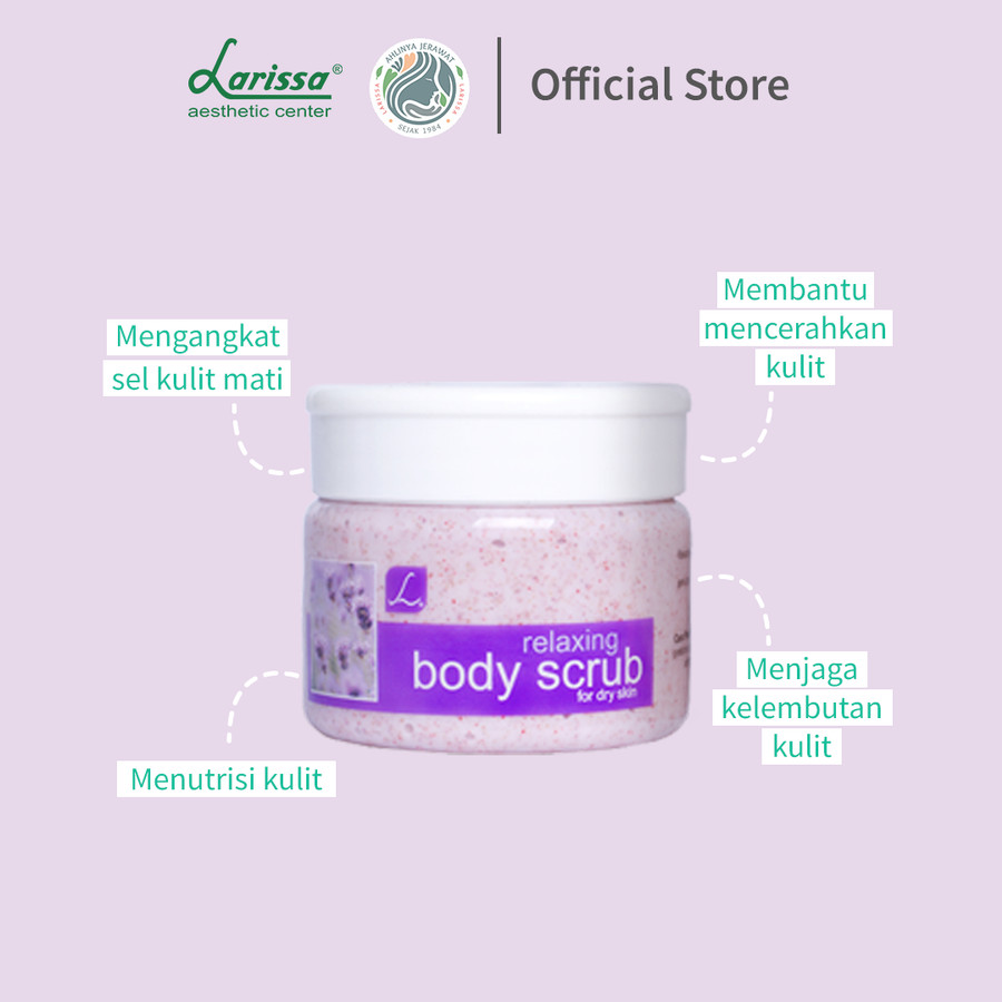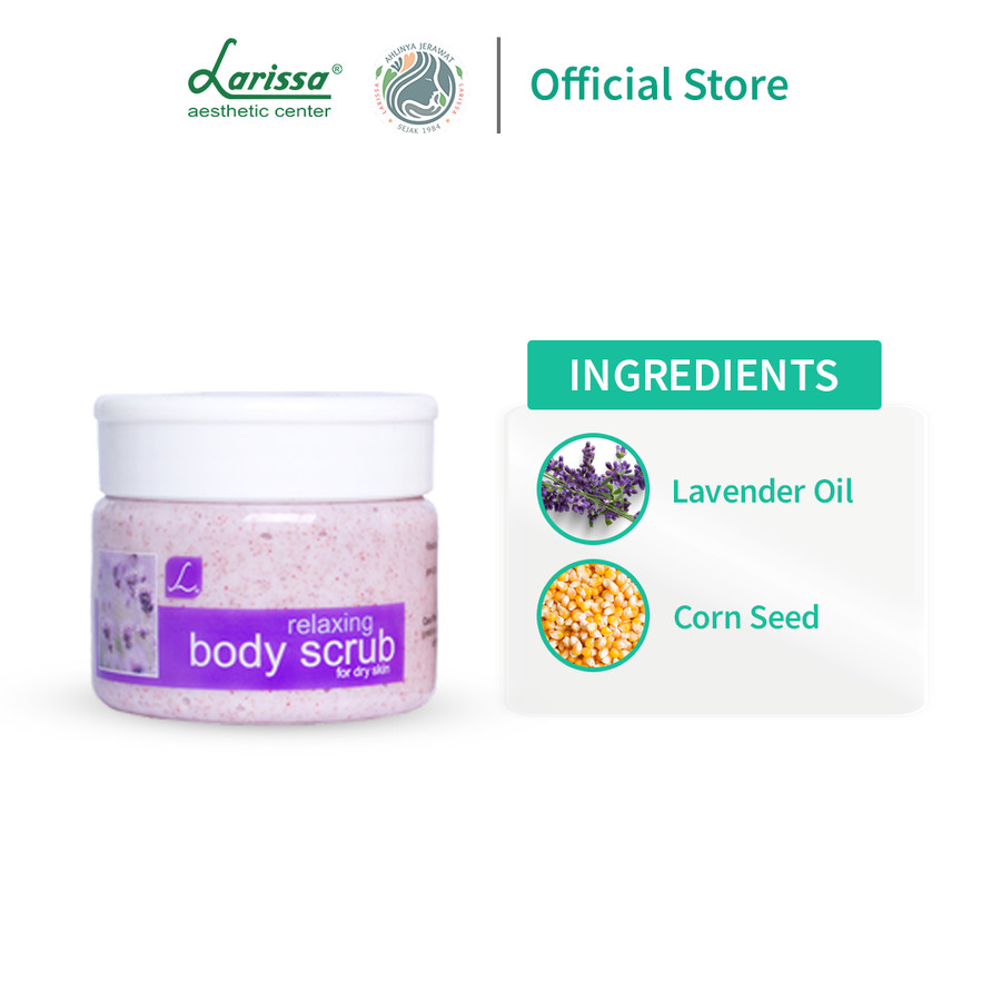 Larissa Aesthetic Center menghadirkan Relaxing Lavender Body Product yang terdiri dari Relaxing Lavender Body Wash, Relaxing Lavender Body Lotion, Relaxing Body Scrub. Rangkaian Relaxing Lavender Body Products Larissa mengandung lavender oil dan vitamin B3 untuk melembabkan, menutrisi dan mencerahkan kulit yang cocok digunakan untuk kulit kering.