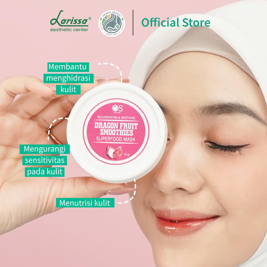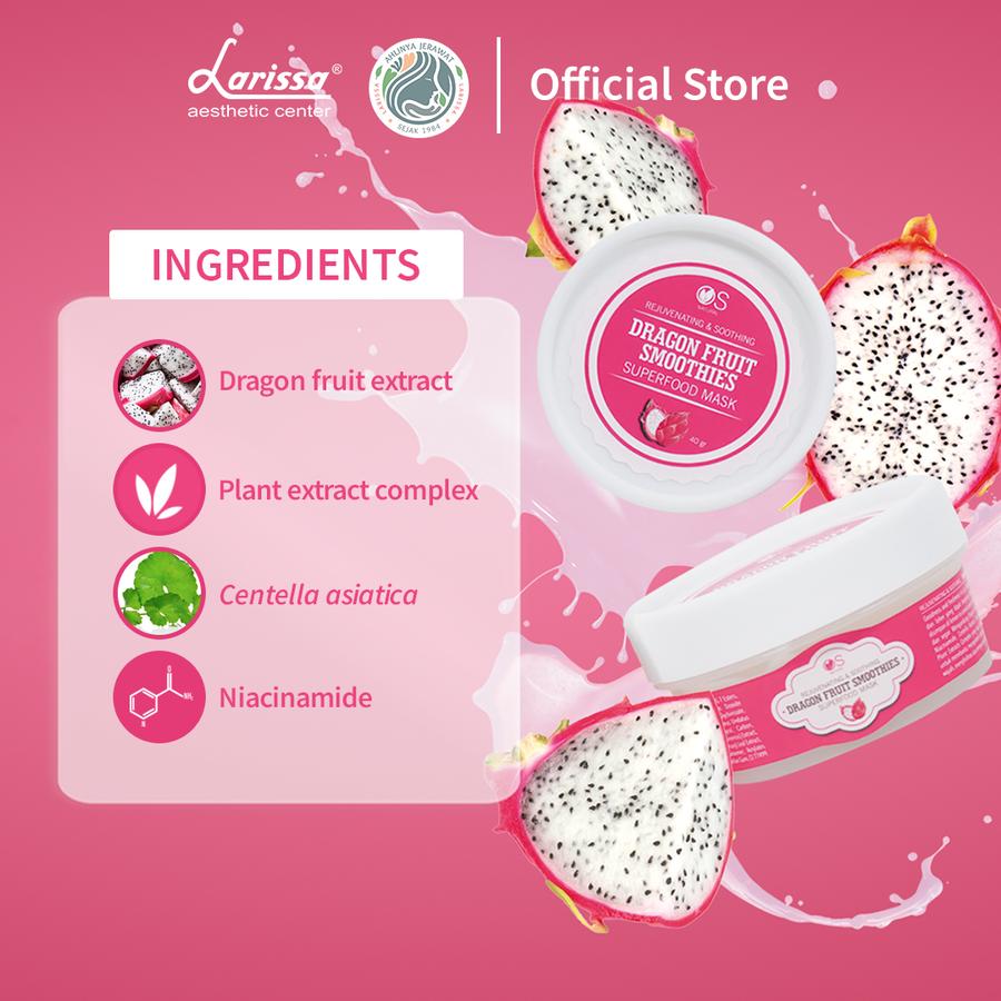 Larissa Dragon Fruit Smoothies Superfood Mask dengan bulir buah asli. Mengandung bahan alami superfood untuk mencerahkan kulit. Goodness and Freshness in a jar. Masker wajah dan leher yang dapat langsung dipakai atau disimpan dalam lemari es untuk sensai lebih dingin dan segar. Mengandung Dragon Fruit Extract, Niacinamide Centella Asiatica Extract dan 7 Plants Extracts yang kaya akan nutrisi untuk memperbaiki regenerasi kulit wajah, menhhidrasi dan mengurangi sensitivitas.